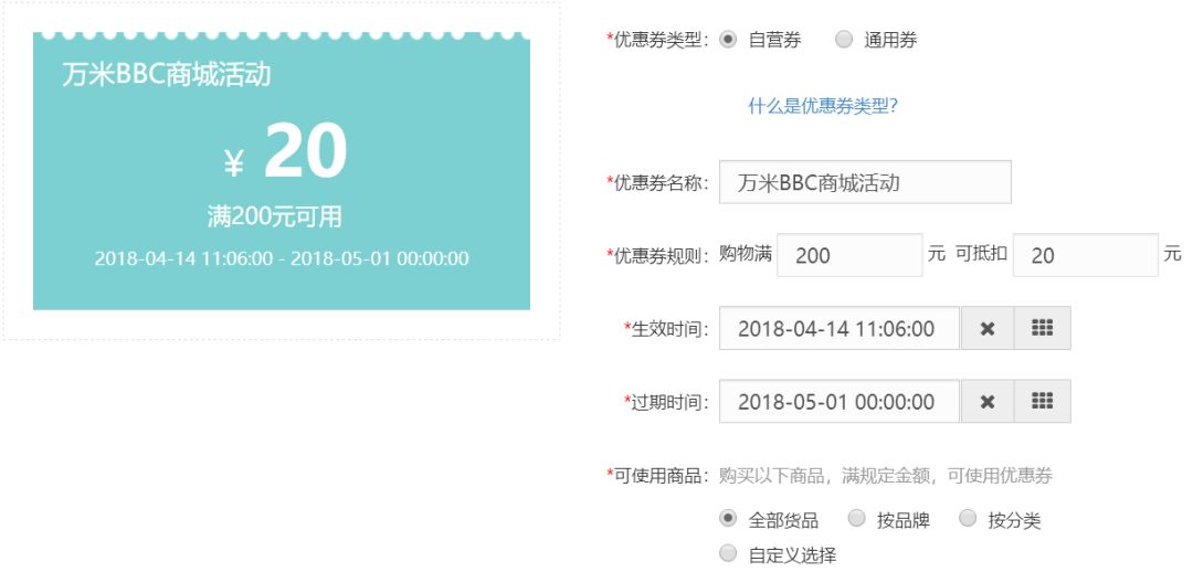 通過降低訂單金額的方式促進用戶下單,可針對全部商品或指定商品發放優惠券,并設置好有效使用時間。優惠券可以在客戶產生消費時作為一種反饋激勵,用戶在領取后可在有效期內使用,下單時直接抵用現金𓄧;