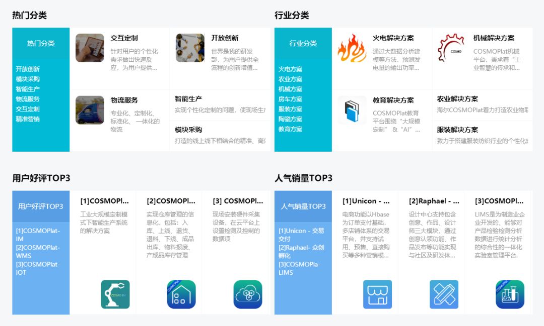 · COSMOPlat工業應用市場,是海爾COSMOPlat旗下一站式工業SaaS交易及交ꦜ付平臺,承接工業制造云生態各個鏈條產品的落地。應用市場作為一個在線的軟件及服務平臺,主要面向企業用戶、服務供應商以及平臺運營商等三方角色。通過應用軟件選購市場、服務供應商中心、企業用戶中心以及完備的服務監管等系統功能建設,將更多的工業應用、品牌產品及算法資源賦能給企業客戶,從而為工業制造云生態提供一套完整的從售前、交易到售后的應用軟件服務及客戶利益保障體系。