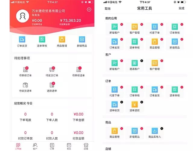 2、個性化的工作臺提高了商家的經營效♐率,所有代辦事項都會有提示,操作簡單、處理方便;尤其是店鋪每日的經營數據,都會實時呈現,讓商家對店鋪的日經營情況“了然于胸”;此外商家的員工還可自行配制自己的常用工具,對于員工沒有權限看到的部分則會自動隱藏,方便靈活、安全可靠。