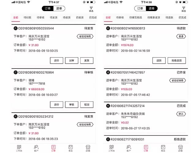 5、訂/退單管理ജ智能高效,🉐手機端即可處理,及時審核發貨,牢牢把握商機,分分鐘審核退款,客戶體驗感更好。