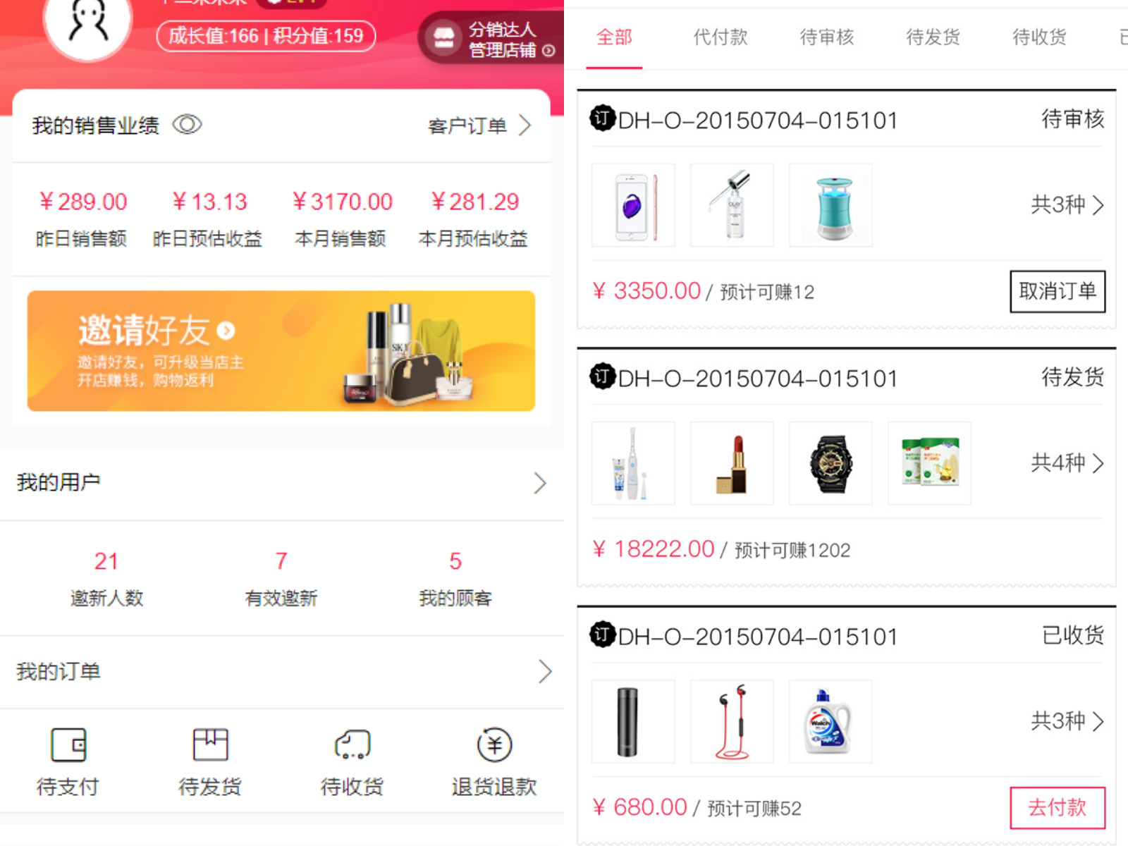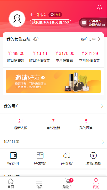 平臺的任何會員都可以申請成為分銷員。成為分銷員后,個人首頁除了新增分銷員的銷售業績、自己的客戶ꦅ以及客戶訂單等外,還新增“管理店鋪”的入口。