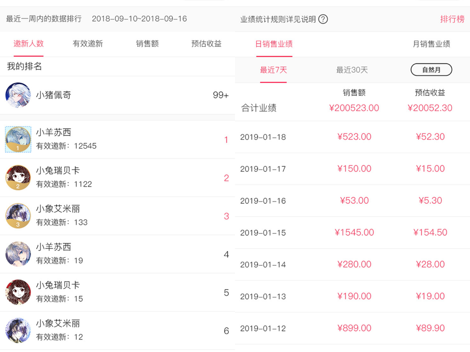 分銷員點擊銷售業績,可按日/月查看自己的銷售業績,也可以🐓通🅘過排行榜了解自己在分銷員中的業績排名。排行榜包含銷售額、預估收益、邀新人數、有效邀請的排名。