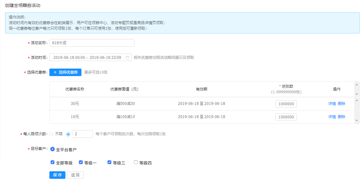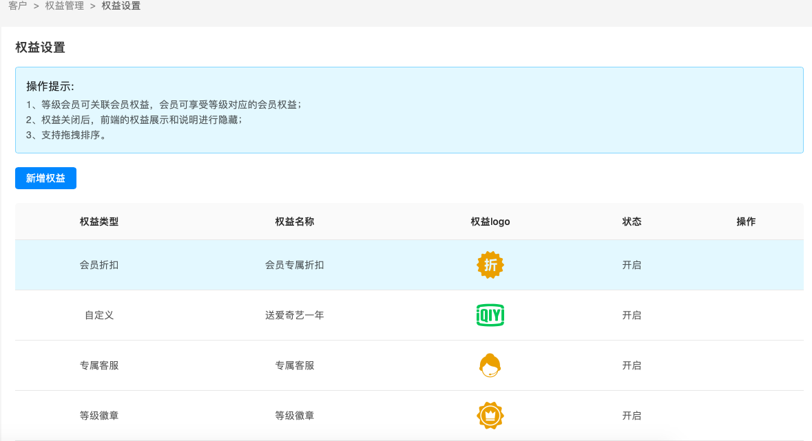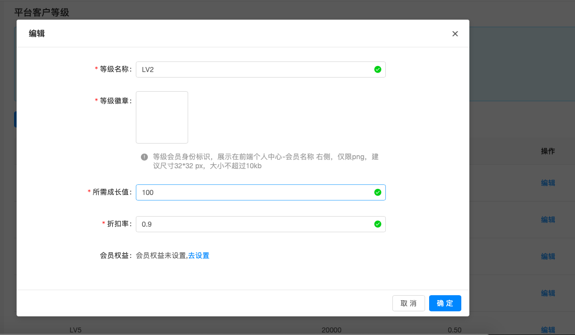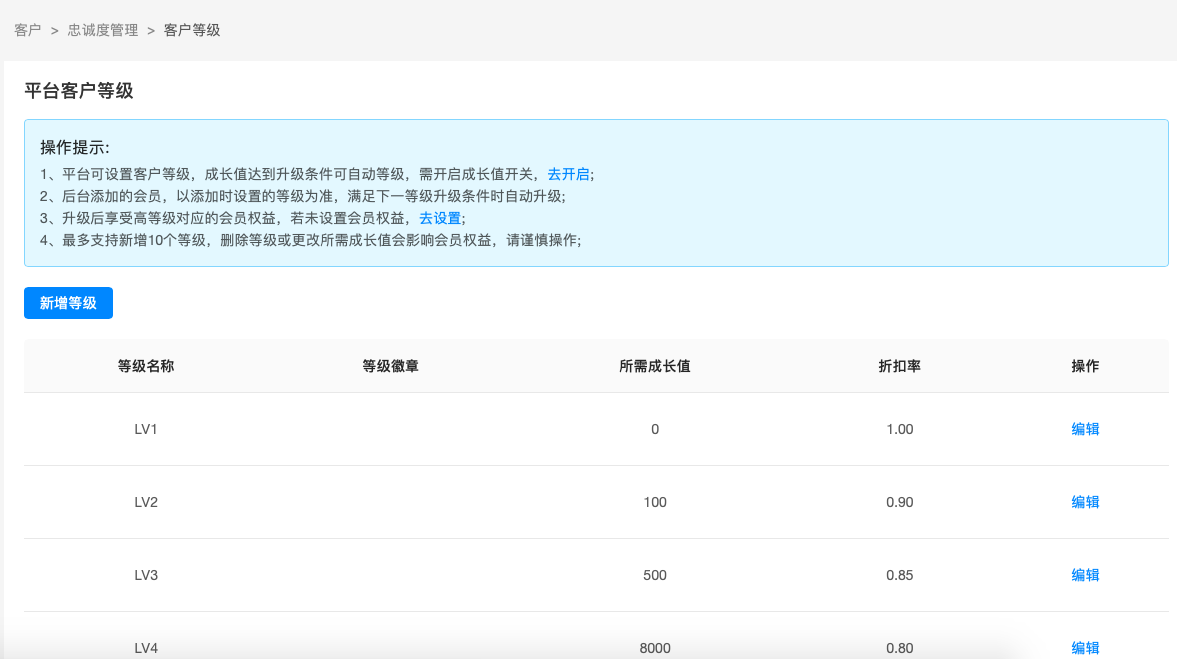 平臺可設置客戶等級,成長值達到升級條件可自動等級。等級會員可關聯會員權益,會員可享受🔜等級對應的會員權益。