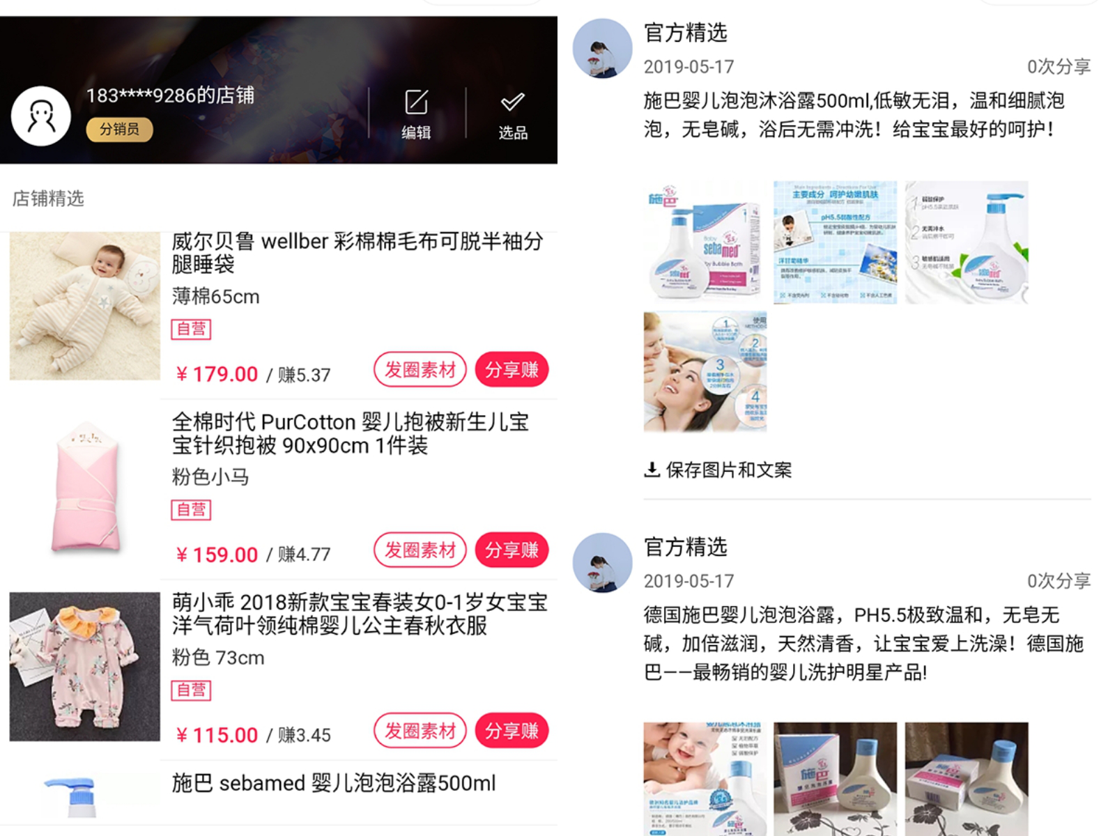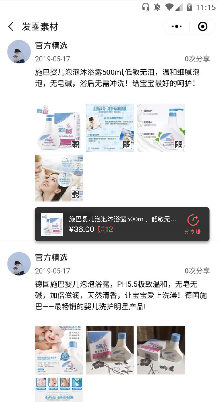 1、商品素材:圖片下方顯示該素材關聯的分銷商品信息,點擊商⛄品信息欄進入商品詳情頁,點擊分享賺,底部喚起圖文分享