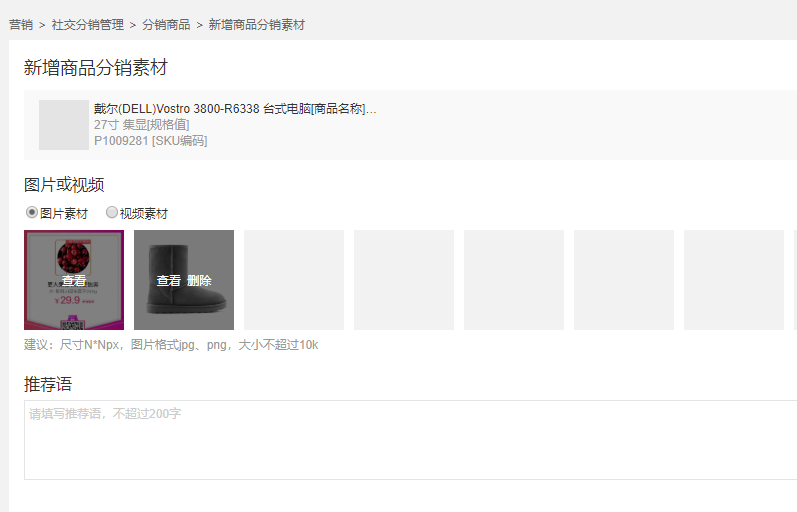 點擊新增分銷素材添加對應商品的營銷素材,圖片可以多選,建議3🌄/6/9張為宜,注意圖片的清晰度以及選擇大眾喜歡的圖片風格,既能體現商品的美觀實用同時又保真。