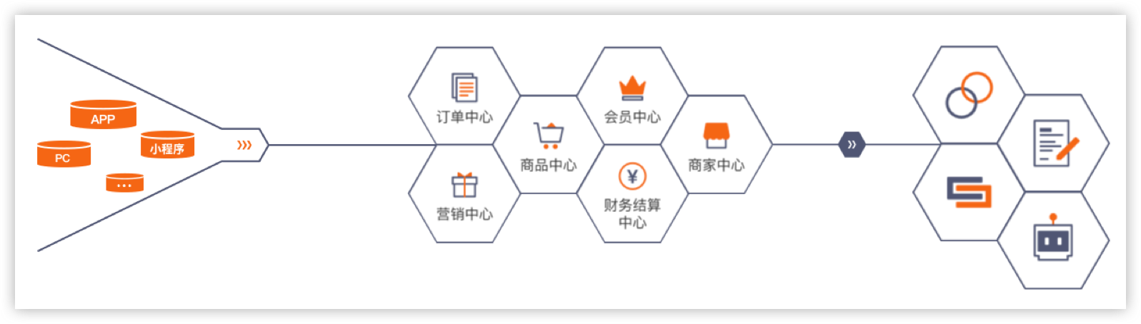 支持多個前臺業務,構建供𒁏貨中臺、訂單中心、商品中心、會員中心、分銷中心、商家中心、營銷營銷、財務中心等,提供各業務方快速、低成本創新的能力,幫助企業快速適應業務變化。