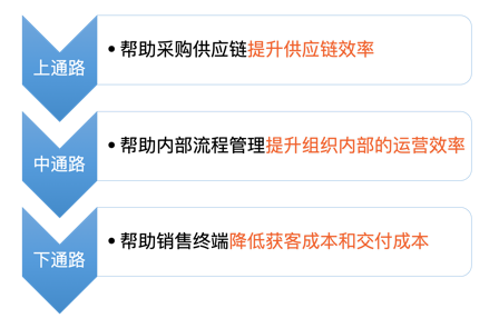 產業互聯網致力于打通產業鏈上下游之間的信息通路,搭建行業SaaS就是要站在全產業鏈的角度幫助“上通路”(采購供應鏈)提升供應鏈效率,幫助“中通路”(內部流程管理)提升組織內部的運營效率,幫助“下通路”(銷售)降低獲客成本和交付成本,從整個產業流通大格局的角度實現“生產-流通-消費”整個⛄通路的信息化、數字化、互聯化、智能化。