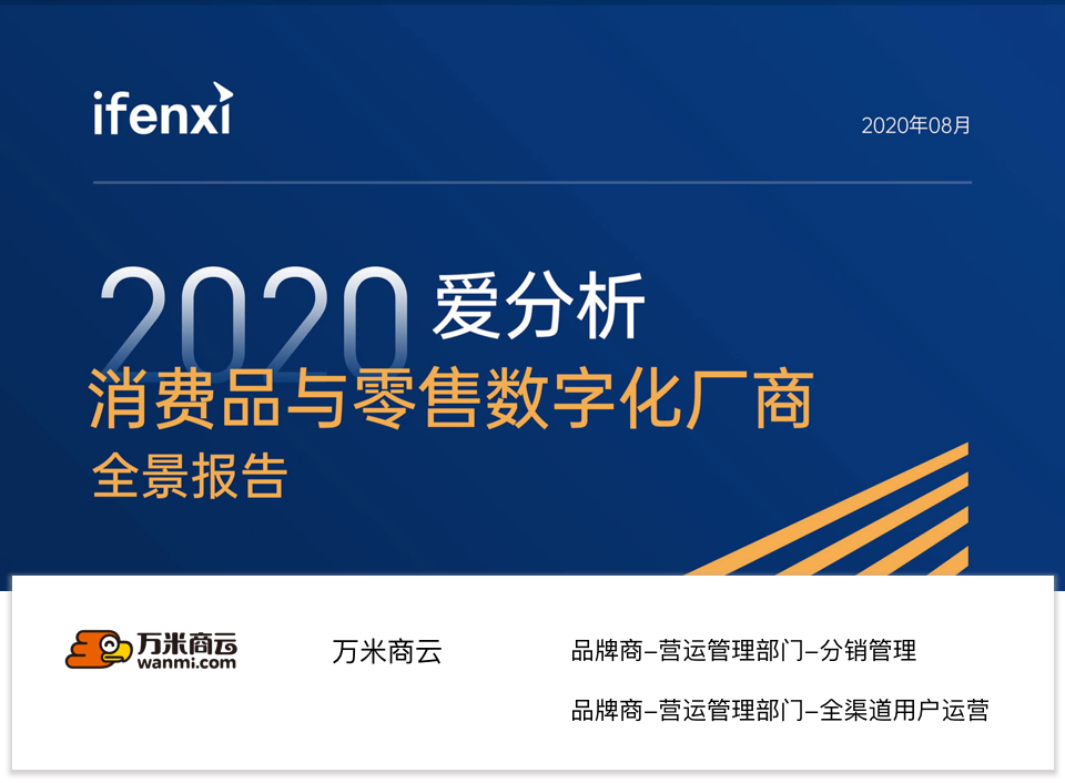 近日,中國領先的產業數字化研究與咨詢機構-愛分析正式發布了《2020愛分析·消費品與零售數字化廠商全景報告》,基于對消費品與零售行業品牌商、零售商和數字化廠商的調研,遴選出數字化應用📖場景中具備成熟解決方案和落地能力的廠商,萬米商云入選本次報告中👍分銷管理和全渠道用戶運營兩大應用場景。