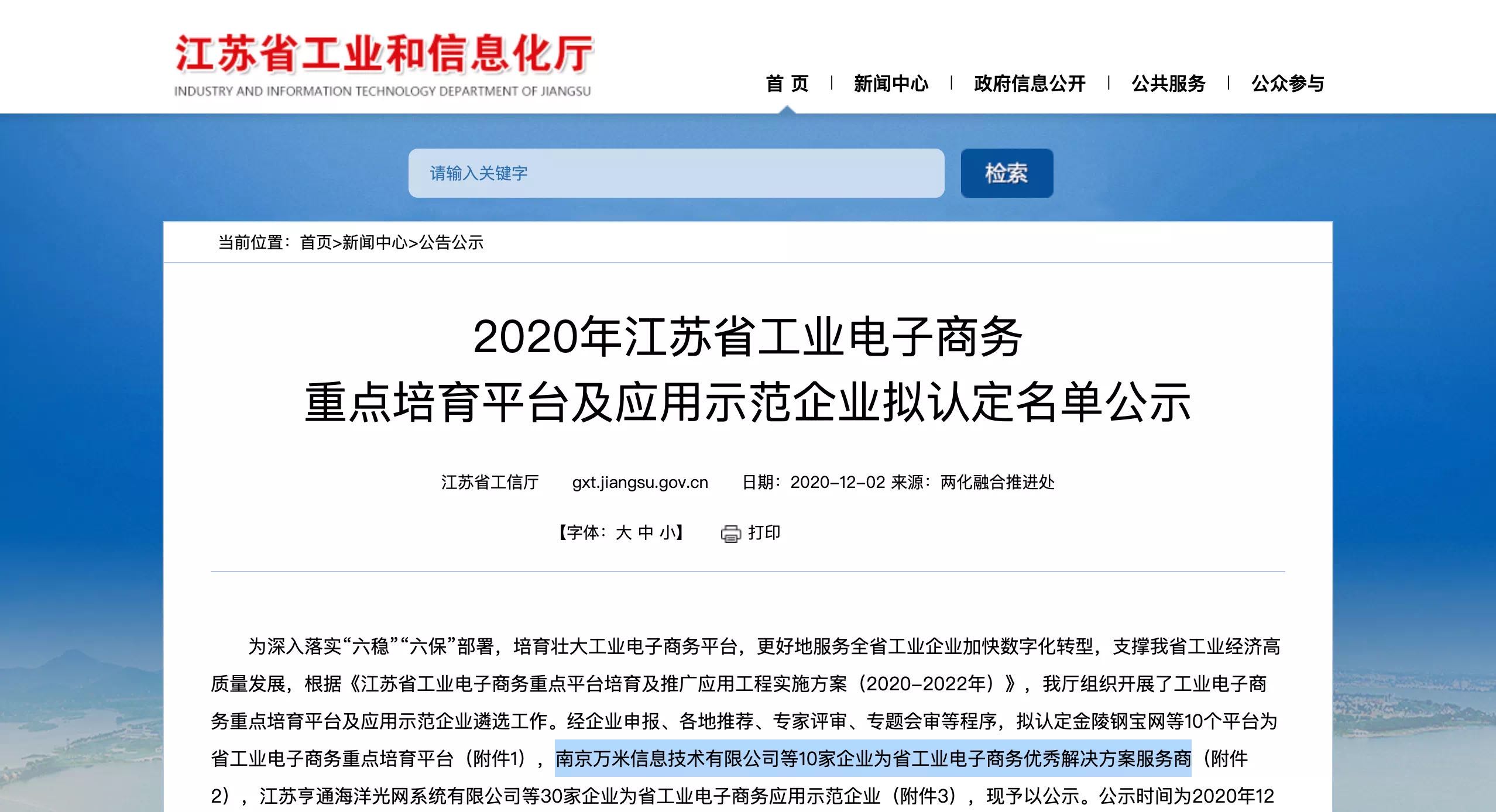 江蘇省工信廳根據《江蘇省工業電子商務重點平臺培育及推廣應用工程實施方案(2020-2022年)》,組織開展了工業電子商務重點培育平臺及應用示范企業遴選工作。經企業申報、各地推薦、專家評審、專題會審等程序,南京萬米信息技術有限公司被評選為省工業電子商務優秀解決方案服務商。