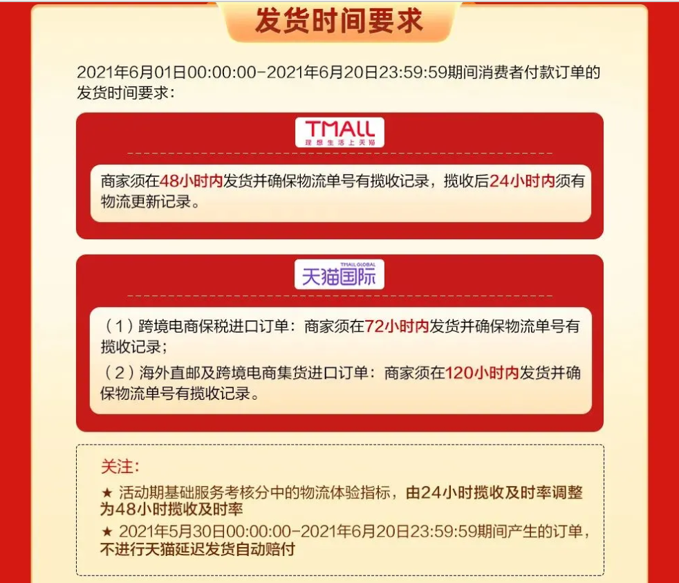 618活動期♍間,不進行天貓延遲發貨自動賠付,同時,基礎服務考核分中的物流體驗指標由24小時攬收及時♌率調整為48小時攬收及時率。