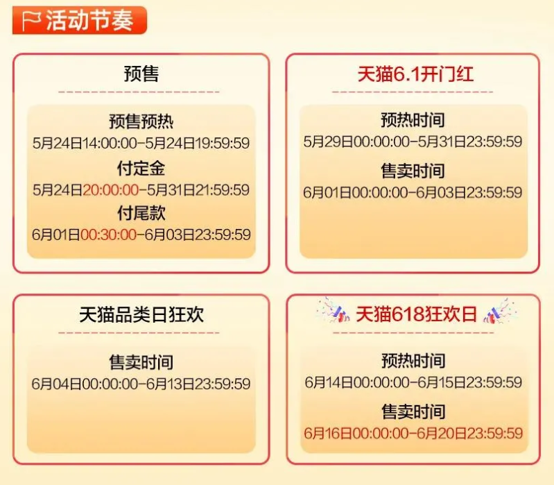 淘寶預售時間節點則與天貓一樣,即預售售賣從5月24日20:00-5月31日22:00,支付尾款時間為6月1🧸日00:30-6月3日24:ꦑ00。