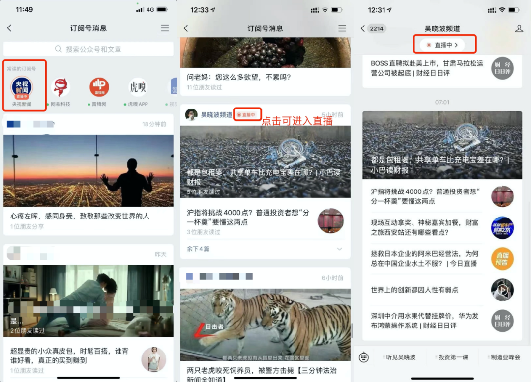 在視頻號和公眾號綁定的前提下,如果視頻號正在直播,其訂閱號會顯示直播狀態,共有三種場景: