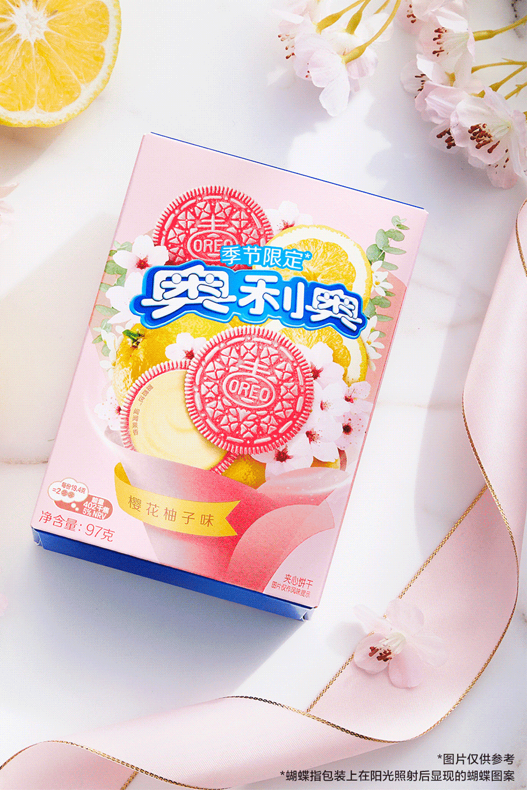 以奧利奧春日新品櫻花柚子味餅干為例,品牌嘗試了黑科技玩法:包裝在經過陽光照射后會出現蝴蝶,營造出一種蝴蝶💙受花果香吸引而來的效果。