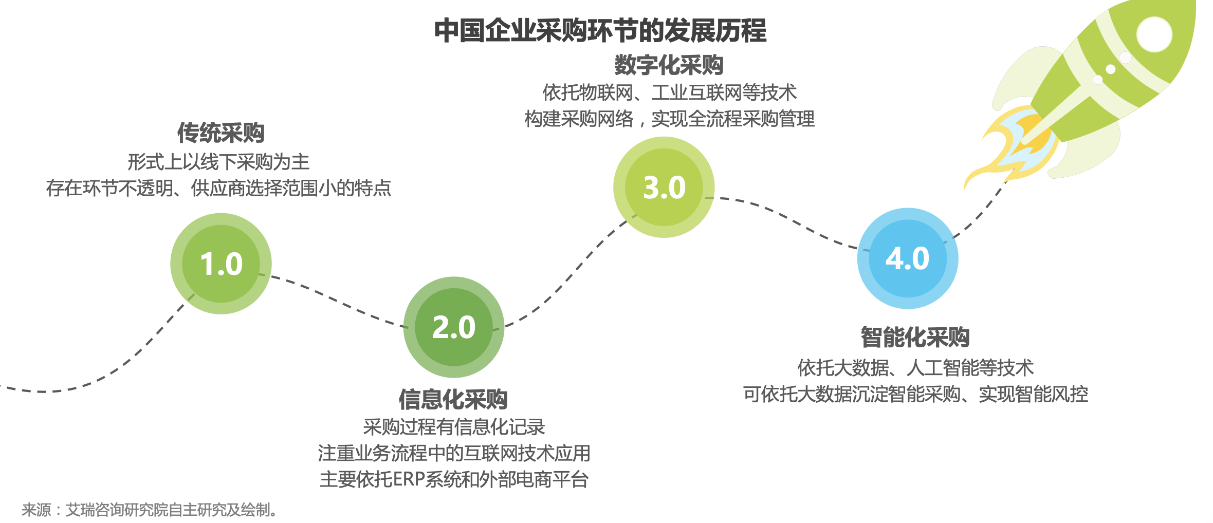 企業采購ไ包括了需求搜集、采買以及投入使用的全過程。由于采購環節在企業降本增效的實踐中意義重大,所以采購業務的數字化升級也被逐步重視。我們將采購的發展歷程分為四個階段,最早期是以完全的線下采購為主,范圍局限在企業所在城市地區。第二階段是信息化采購,應用計算機對業務信息進行留存。第三階段是數字化采購,得益于產業互聯網的發展和基礎信息建設的進步,所涵蓋的內容也擴展為從供給端的尋源、匹配、采購,管理和需求端的需求統計、上報、采購、分發全鏈條的泛采購概念。第四階段,采購業務將在充分數字化的基🐻礎上實現智能化,構建采購生態。