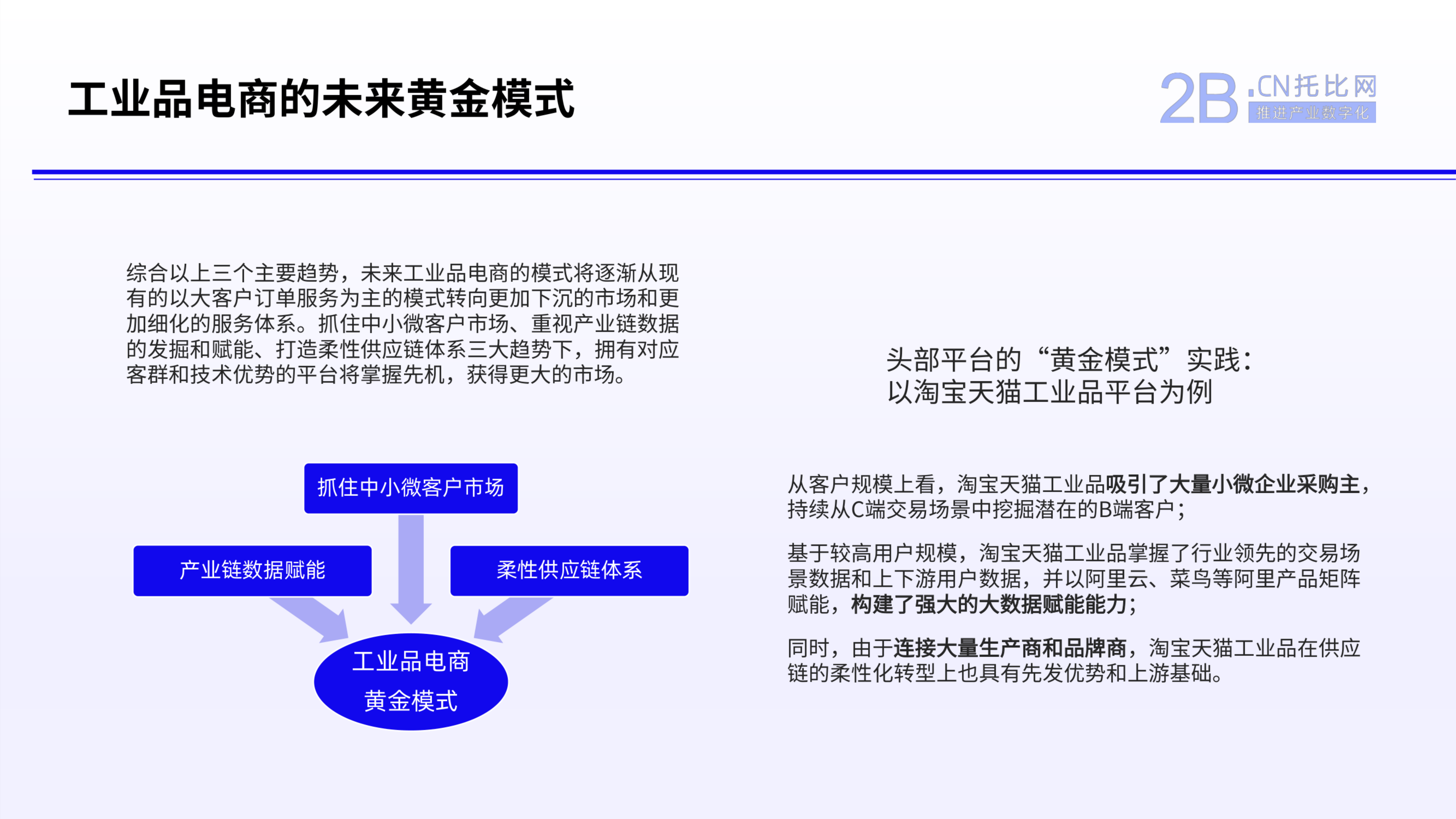 未來工業品電商的模式將逐漸從現有的以大客戶訂單服務為主的模式轉向更加下沉的市場和更加細化的服務體系。抓住中小微客戶市場、重視產業鏈數據的發掘和賦能、打造柔性供應鏈體系三大趨勢下,擁有對應客群和技術優勢的平臺將掌握先♎機,獲得更大的市場。