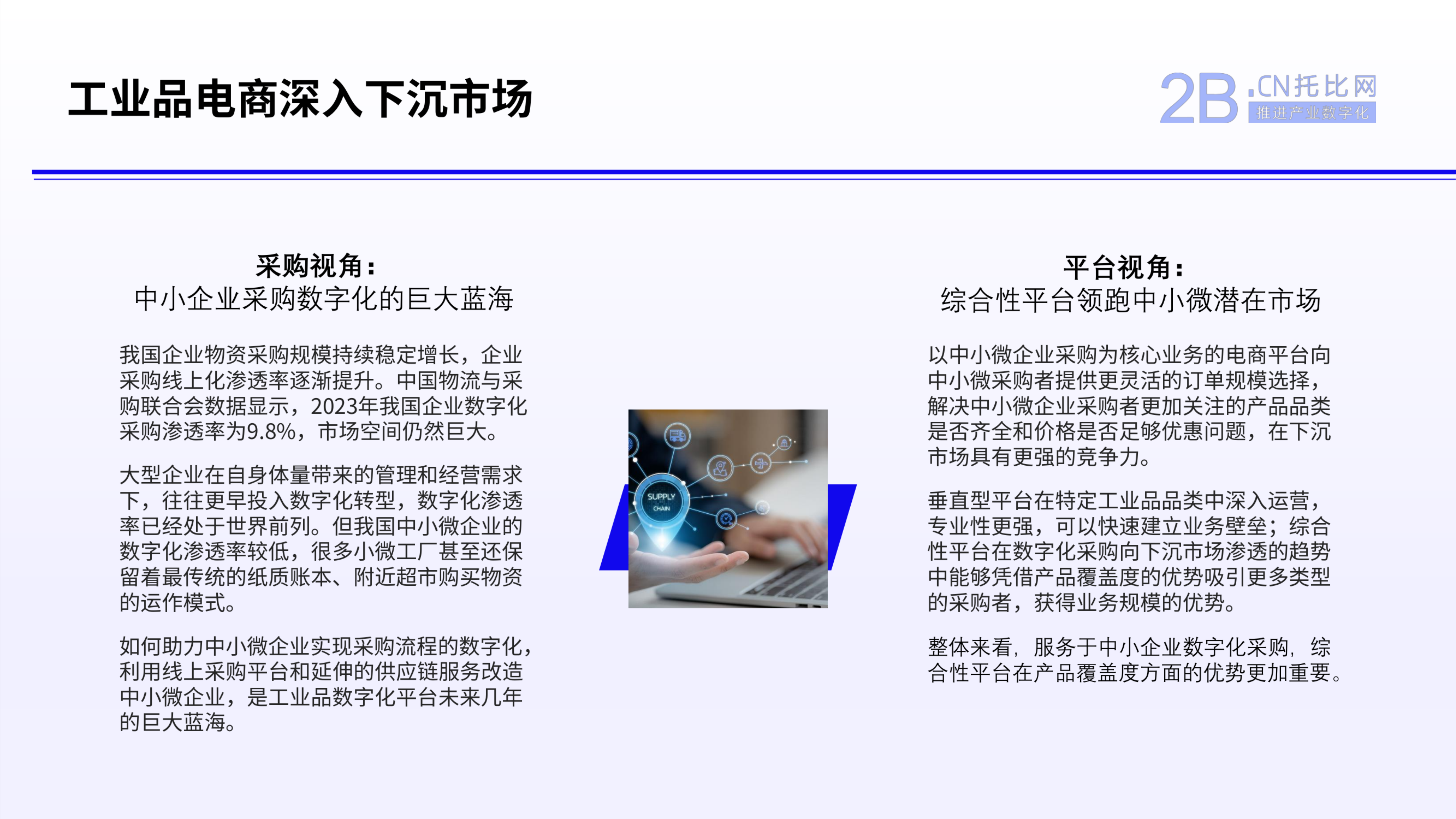 從采購視角和平臺視角分析,助力中小微企業實現采購流程數字化,ꦓ利用線上采購平臺和延𒈔伸的供應鏈服務改造中小微企業,是工業品數字化平臺未來幾年的巨大藍海。