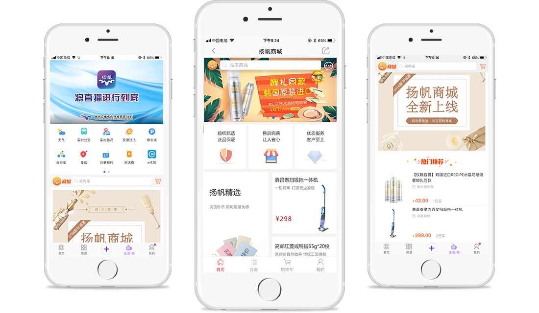 萬米為揚州廣電提供了一套支持商戶入駐開店的BBC模式的商城系統,包括PC端和H5端,并將H5商城系統內嵌到揚帆APP中,和其原有的ꦛ會員數據實現同步,實現單點登錄。