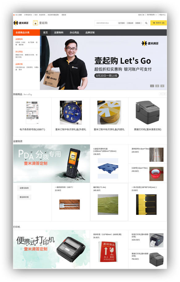 由于壹米滴答網點數量眾多,網點所用物流運營物資(如包裝箱、標簽紙等)、勞保用品、辦公用品等必須采用壹米滴答定制物資,所以網點必須向總部進行物資采購。而傳統的采購方式多為電話、郵件等方式,人力成本高、效率低꧅,且容易出錯。為了提高內部采購流程的效率,壹米滴答在萬米的協助下,開發了面向各網點提供運營、辦公物資的內部采購平臺——壹起購。