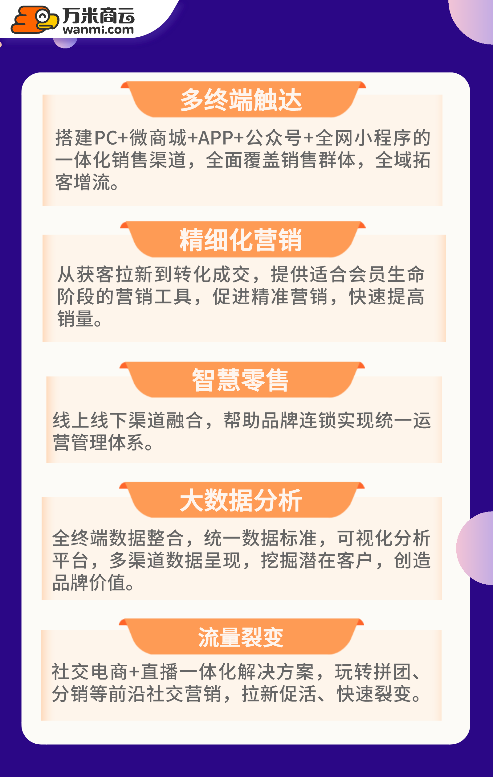 萬米商云是一家新零售及產業互聯網技術服務公司,堅持“產品+解決方案”的模式,服務了超1000家中大型企業客戶的電商及數字化轉型,在消費品的分銷、零售流通領域,為客戶打造全渠道私域電商系統、會員精準營銷中臺系統、連鎖門店新零售管理系統、垂直產業SaaS電商系統等產品并提供技術服務,定制全渠道數字化營銷方案,實現新零售ও全域流量增長,促進流量的沉淀,轉化和交易。
